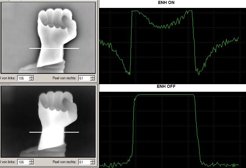 2 Bilder von meiner Hand, mit und ohne ENH. Die Bilder wurden mit dem Spektrometer Programm ausgewertet. Die Messlinie liegt am Handgelenk, da dort die Flächen groß genug sind um die Arbeitsweise des Filters zu erkennen. An den Graphen sieht man, wie Temperaturdifferenzen angeglichen werden und dadurch die Darstellung insgesamt verfälscht wird.