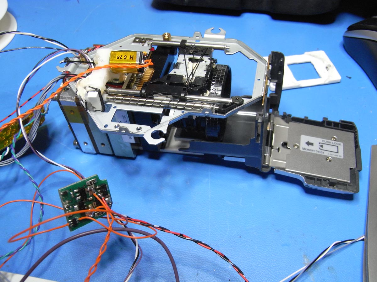 Ich hatte mal von einem alten Notebook das CD-Laufwerk entfernt. Davon habe ich das Laser Transportsystem ausgebaut und mit der Kamera verbunden. Das Objektiv wurde direkt auf dem Laserhalter befestig und der Transportmotor durch einen kleinen Getriebemotor ersetzt.